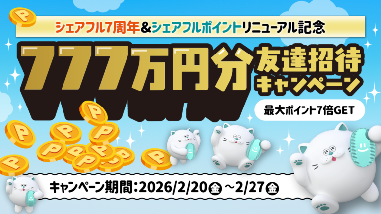 シェアフル株式会社~「777万ポイント山分け 友達招待キャンペーン」で最大ポイント7倍、合計最大140,000ポイント獲得のチャンス~ 「はたらいて、笑おう。」をビジョンに掲げるパーソルグループのスキマバイトアプリ『シェアフル』やSaaSシフト管理サービス『シェアフルシフト』、就業実績を活用した人材紹介サービス『シェアフルエージェント』などを提供するシェアフル株式会社(本社:東京都港区、代表取締役社長:横井 聡)は、アプリ提供開始7周年および『シェアフル』アプリ内のポイ活機能「シェアフルポイント…