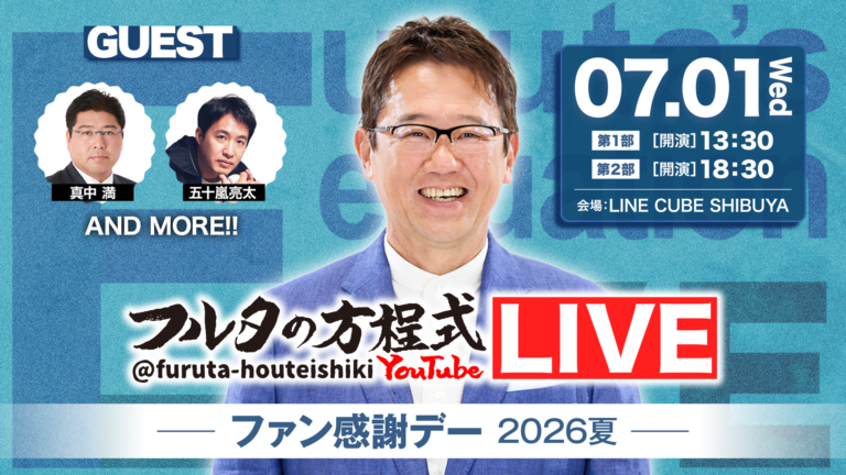 株式会社テレビ朝日『フルタの方程式LIVE! ―ファン感謝デー2026夏―』 2026年7月1日(水) LINE CUBE SHIBUYA ■登録者約101万人、投稿本数は500本以上、総再生回数は約6億回!YouTubeチャンネル「フルタの方程式」大盛況だったオフラインイベントの2回目を、7月にLINE CUBE SHIBUYAにて開催決定!