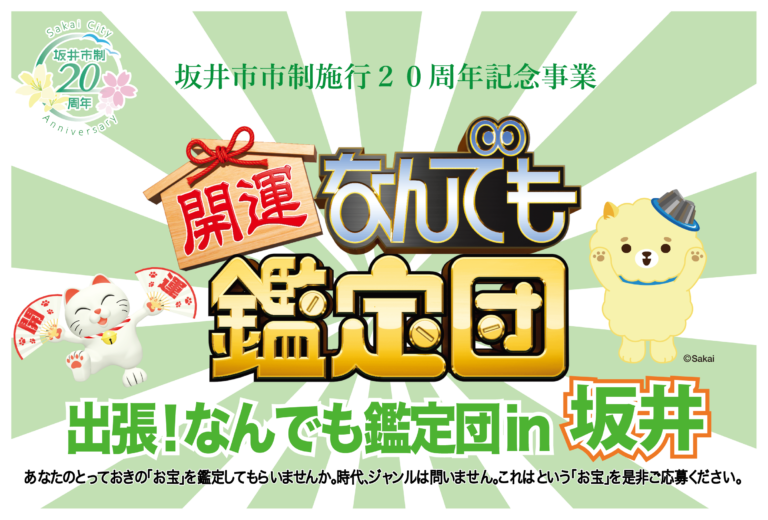 市制施行20周年を記念して、テレビ番組「開運なんでも鑑定団」の出張鑑定「出張!なんでも鑑定団in坂井」の公開収録が、8月2日(日)にハートピア春江で開催されます。開催に伴い、当日会場で鑑定する「お宝」及び公開収録の観覧者も募集します。 【開催概要】
