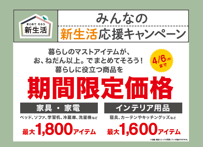 【ニトリ】暮らしのマストアイテム、最大3,400アイテムが期間限定価格に!「みんなの新生活応援キャンペーン」2月20日(金)からスタート