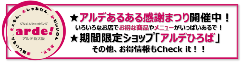 株式会社新大阪ステーションストア「アルデひろば」「アルデひろばプラス」の期間限定ショップ、アルデあるある感謝まつり、WESTERポイントアップなど、お得な情報をお届けします! 「アルデ新大阪」は、大阪・関西の玄関口である新大阪駅の2階(改札外)にあるショッピングセンター。