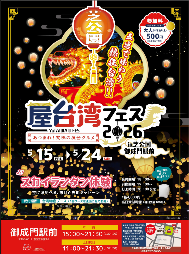 【芝公園】東京が台湾に染まる10日間!スカイランタンが舞い、巨大ドラゴンが吠える『屋台湾フェス2026』5/15開幕。入場特典の“手持ち提灯”で夜市に没入!