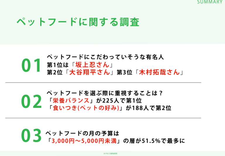 株式会社みやむら動物病院ペットフード選びは「栄養バランス」と「食いつき」が上位に 現役獣医師がペットフードの開発も行っているみやむら動物病院(所在地:江戸川区、院長:宮村 卓馬、https://m-petclinic.com/)は、愛犬家303人を対象に、ペットフードに関する調査を実施しました。 近年、犬の健康寿命への関心が高まるにつれ、日々の食事や栄養管理に対する意識も変化しています。一方で、ペットフードの種類や情報が多様化する中、どのような基準でフードを選び、どのような情報を参考にしている…