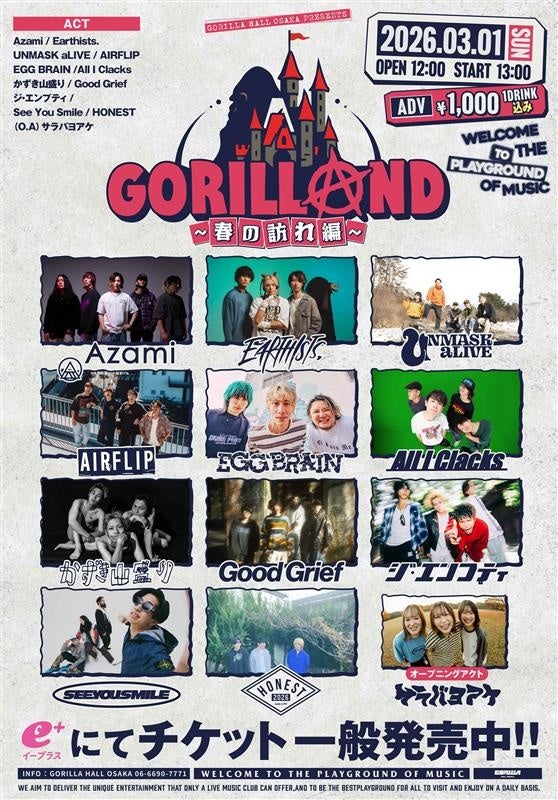 In the village合同会社2026年3月1日(日)に『GORILLAND ~春の訪れ編~』、3月8日(日)に『GORILLA PUNK RIOT!!』開催!! 大阪・GORILLA HALL OSAKAは、2026年3月1日(日)に『GORILLAND ~春の訪れ編~』、3月8日(日)に『GORILLA PUNK RIOT!!』と題した自主企画イベントを、会場として初となる2週連続で開催する。本企画は、近年さまざまな議論が交わされているライブハウスの来場システムや1DRINK制について…