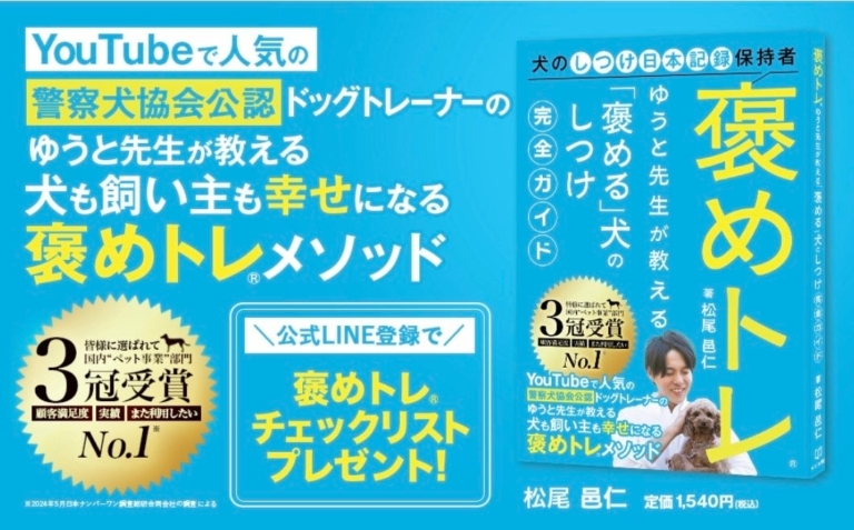 株式会社東京DOGS犬のしつけ頭数 日本記録保持者・松尾邑仁 初の著書~2026年2月10日(火)全国書店・オンライン書店にて発売 犬のしつけ教室「東京DOGS」(本社:埼玉県越谷市/代表:松尾邑仁)は、当社代表であり警察犬協会公認訓練士/ドッグトレーナーの松尾邑仁(マツオ ユウト)が執筆した初の著書『褒めトレ(R) ゆうと先生が教える「褒める」犬のしつけ完全ガイド』(単行本)が、2026年2月10日(火)に全国の書店およびオンライン書店にて発売されたことをお知らせいたします。