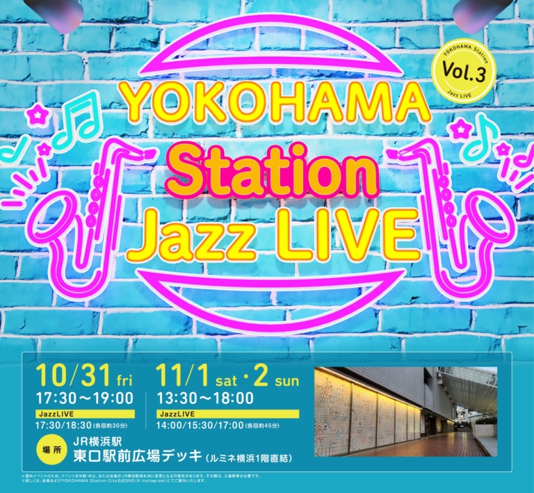 YOKOHAMA Station City 運営協議会「ジャズの街・ヨコハマ」の玄関口、横浜駅から音楽を通じたエリア価値の向上を推進 YOKOHAMA Station City運営協議会(会長:東日本旅客鉄道株式会社 執行役員 横浜支社長 矢野 精一)は、10月31日(金)~11月2日(日)の3日間、JR横浜駅 東口駅前広場デッキにて「YOKOHAMA Station Jazz LIVE Vol.3」を開催いたします。