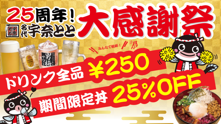 昼も夜も「2525」円満!宇奈とと25周年感謝祭 第2弾スタート!生ビール含むドリンク全品250円&まかない飯「最強スタミナ丼」が25%OFF!