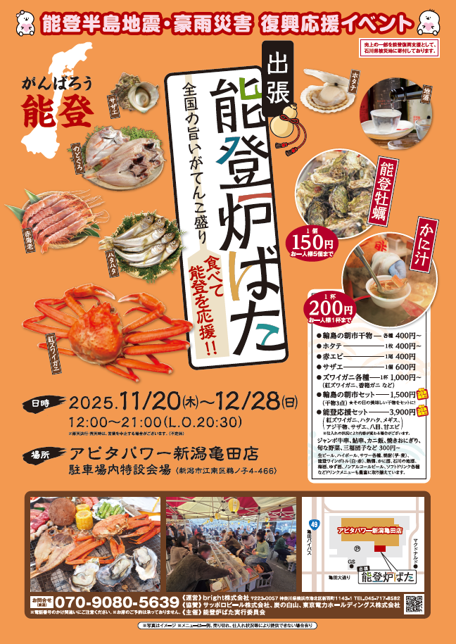 【食べて応援】能登の旬の幸が新潟に集結!「出張 能登炉ばた」がアピタ亀田で開催決定!カニ・牡蠣BBQで復興を後押し!