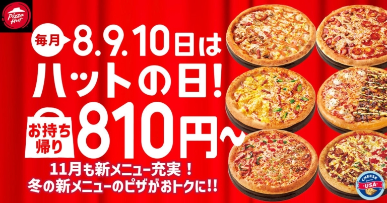 日本ピザハット株式会社~2025年11月8日(土)~11月10日(月)の3日間限定今月も超おトクなイベント開催!~ 日本ピザハット株式会社(代表取締役会長兼社長:深瀬 成利、本社:神奈川県横浜市、以下:ピザハット)が展開する世界最大級のピザチェーン「ピザハット」は、毎月8日・9日・10日を「ハットの日」として、ピザハットの商品をお持ち帰り810円~でご提供するキャンペーンを実施しております。