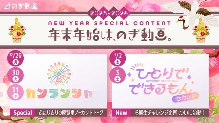 株式会社CAM~年末を彩る特別番組に加え、6期生が登場するオリジナル番組「ひとりでできるもん セカンド」の放送を決定~ 株式会社CAMの子会社である株式会社CAスマートは、乃木坂46公式定額制動画サービス「のぎ動画( https://nogidoga.com )」において、年末年始の特別ラインナップを順次公開いたします。 本日から3日間連続で配信される年末番組は、観覧車という密室で「ツーショットトーク企画」を公開。4期生の賀喜遥香や、2025年12月31日をもってグループを卒業する矢久保美緒…
