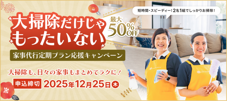 株式会社ニチイ学館~初月基本料金が最大50%OFF!新しい年をすっきり迎える準備をお得に~ 株式会社ニチイ学館(本社:東京都千代田区、代表取締役社長 社長執行役員:中川創太)が展開する家事代行サービス「サニーメイドサービス」は、2025年12月25日(木)まで「大掃除だけじゃ、もったいない 家事代行定期プラン応援キャンペーン」のお申し込みを実施中です。 ■ 大掃除だけじゃ、もったいない 家事代行定期プラン応援キャンペーン