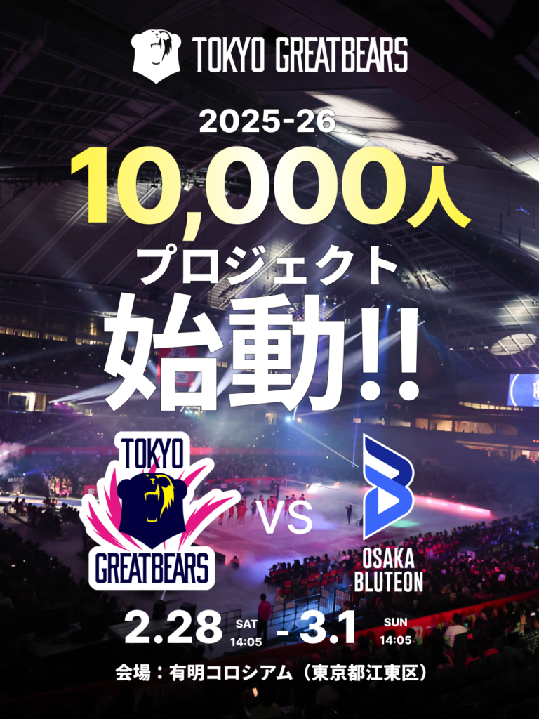 株式会社グレートベアーズ2026年2月28日(土) 3月1日(日) 有明コロシアム このたび、株式会社グレートベアーズ(本社:東京都渋谷区、代表取締役:久保田健司)は、2026年2月28日(土)、3月1日(日)の東京グレートベアーズ ホームゲーム 大阪ブルテオン戦を「10,000人プロジェクト」と銘打って開催することが決まりましたので、お知らせいたします。