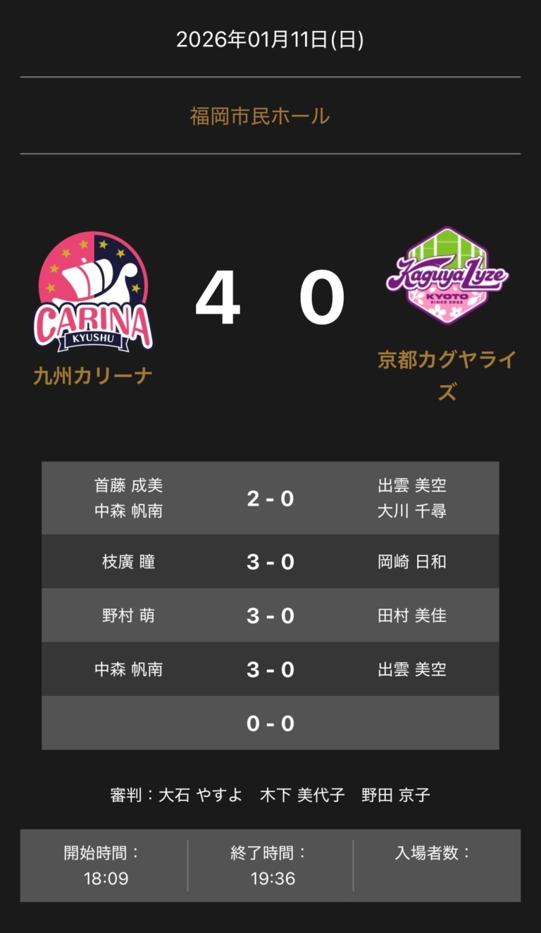 ノジマTリーグ 2025-2026 公式戦 1月11日開催 九州カリーナ vs 京都カグヤライズ 試合結果
