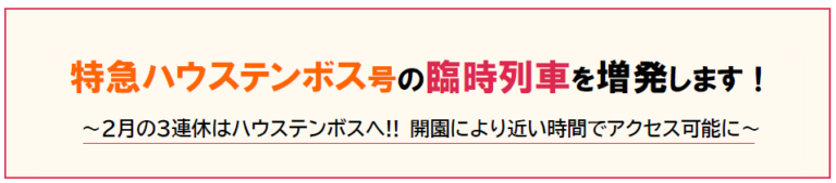 九州旅客鉄道株式会社~2月の3連休はハウステンボスへ!! 開園により近い時間でアクセス可能に~ JR 九州は、2026 年2 月の3 連休において、ハウステンボスへの需要の高まりに対応するため、臨時列車「特急ハウステンボス号」を博多駅からハウステンボス駅まで1 往復増発します。往路は開園により近い時間のハウステンボス駅10 時05 分着で運転し、定期列車よりも早い時間帯でのアクセスを実現します。
