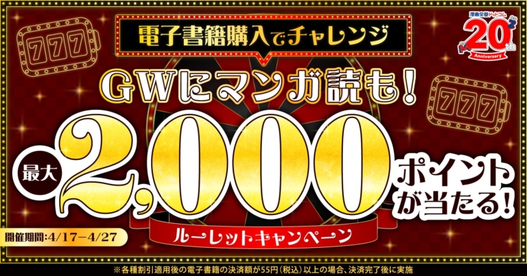 電子書籍55円(税込)以上の決済でポイントやクーポンが当たるルーレット♪ 最大2,000ポイント当選のチャンス!