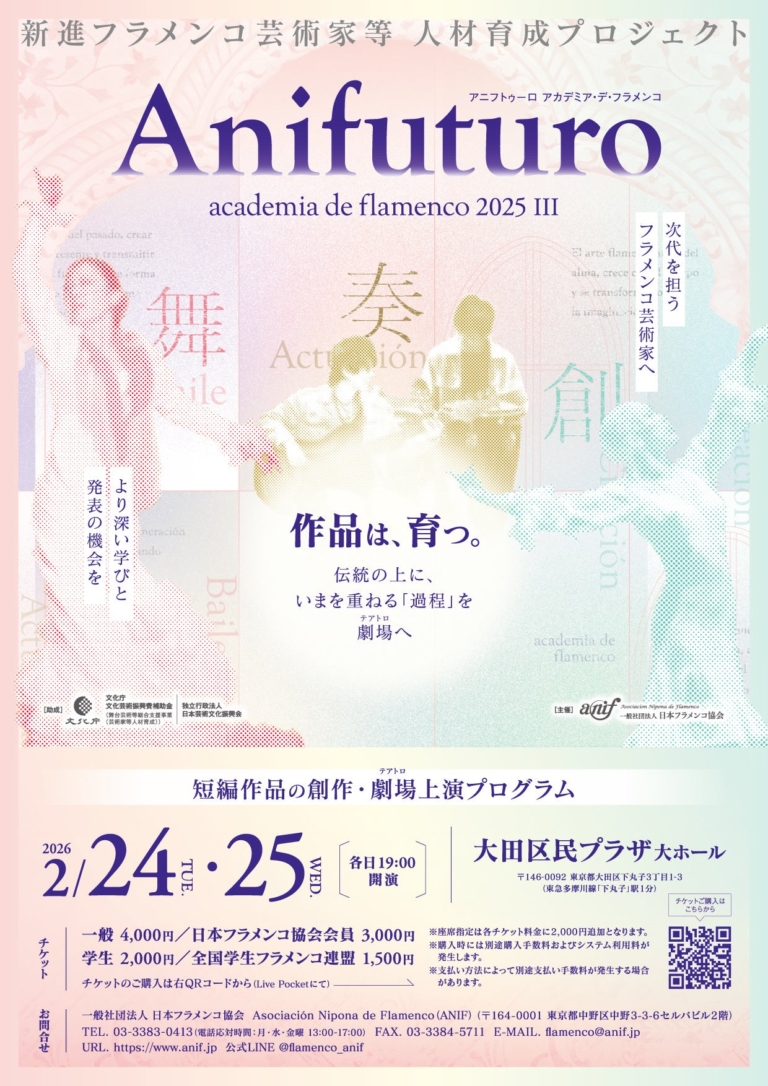 日本フラメンコ協会ANIF~日本フラメンコ協会よる人材育成、3シリーズの最終章となる12の短編作品を上演~ 一般社団法人日本フラメンコ協会(東京都中野区、理事長:鍵田真由美)は、2026年2月24日(火)・25日(水)の2日間、大田区民プラザにて、新進フラメンコ芸術家育成プロジェクトの成果発表公演『Anifuturo – academia de flamenco 2025 III』を開催いたします。 Anifuturo – academia de flamenco 2025 III