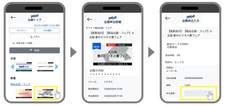 日本出版販売株式会社 日本出版販売株式会社(代表取締役社長:富樫 建、略称:日販)は、“誰でも・どこでも・無料で”使える書店向け発注プラットフォーム「NOCS0(ノックスゼロ)」に、2026年1月21日(水)より新たに企画申込機能を追加しました。 スマホ・タブレット画面イメージ