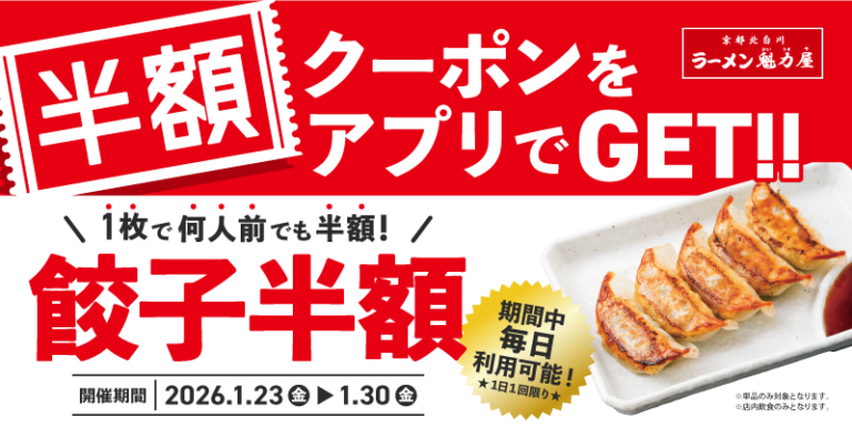 株式会社魁力屋期間中毎日利用でき、何人前でも半額でお楽しみいただける「餃子半額クーポン」を2026年1月23日(金)~1月30日(金)までアプリ限定で配布いたします。※詳細はキャンペーン概要をご確認ください。 京都北白川ラーメン魁力屋をチェーン展開する株式会社魁力屋(https://corp.kairikiya.co.jp/ 本社:京都市中京区、代表取締役社長:藤田 宗、以下魁力屋)は、「餃子半額キャンペーン」を2026年1月23日(金)~1月30日(金)の期間で開催いたします。