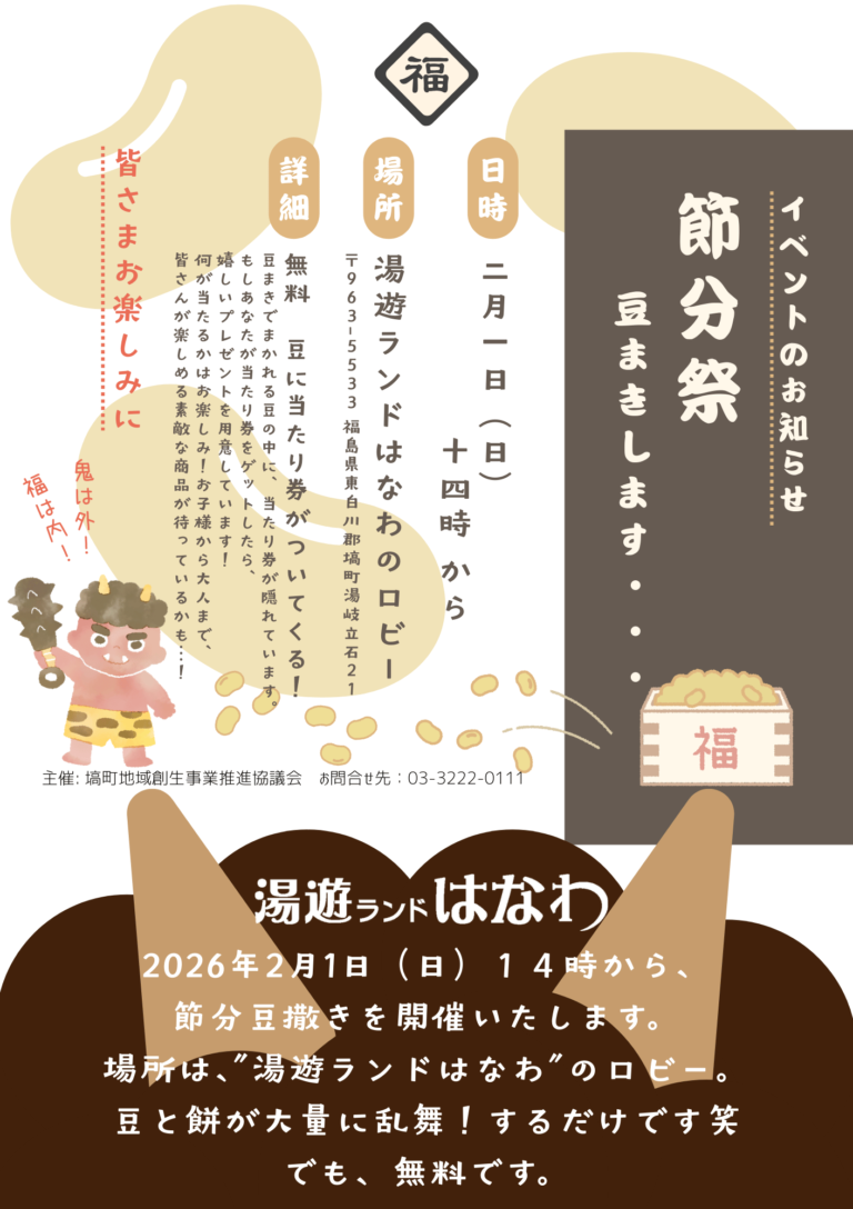 福島県塙町2月1日(日)湯遊ランドはなわで、豆と餅が大量に乱舞!その後はホッコリ温泉でゆっくりDAY 福島県東白川郡塙町の温泉複合施設「湯遊ランドはなわ」にて、2026年2月1日(日)に、