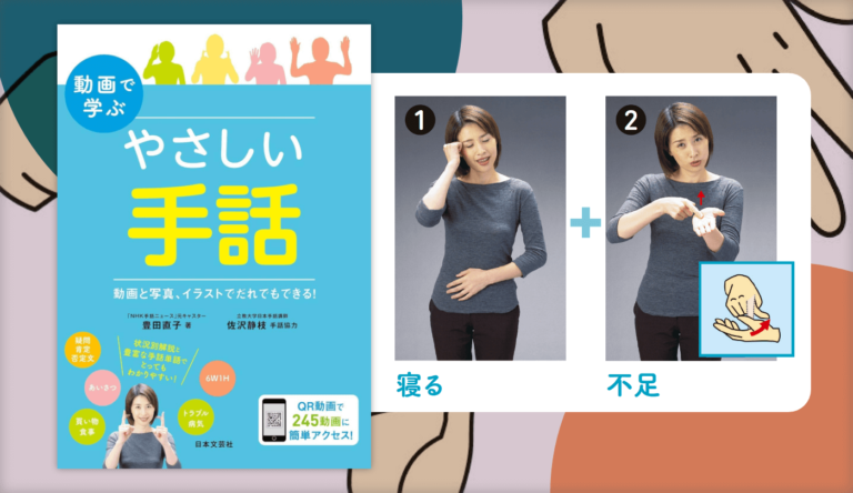 あいさつの表現を覚えよう 「寝坊しちゃった」 【寝坊】握った右手(枕をイメージ)に、もたれるように頭を傾け、右手を上げる。 「寝不足です」 【寝る + 不足】寝るは握った右手(枕をイメージ)に、もたれるように頭を傾ける。 […]