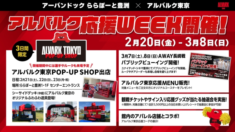 アルバルク東京選手やルークがやってくるPOP-UP SHOPのほか、ユナイテッド・シネマ豊洲にて3/7(土),8(日)AWAY長崎ヴェルカ戦のパブリックビューイングを実施! この度アルバルク東京では、2026年2月20日(金)~3月8日(日)の期間で、アーバンドック ららぽーと豊洲にて「アルバルク応援WEEK」の開催が決定いたしました。
