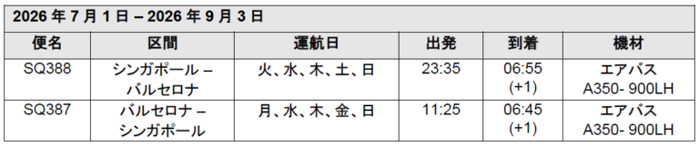 シンガポール航空シンガポール航空(本社:シンガポール、CEO:ゴー・チュン・ポン)は2026年夏期運航スケジュール(2026年3月29日~10月24日)における旅行需要の増加に対応するため、グローバルネットワークの一部路線で運航頻度の見直しによって供給座席数を増やし旅客輸送能力を拡大します。 シンガポール-バンコク線は、2026年3月29日より1日1便を追加し、同路線の運航は1日7便となります。 シンガポール-ヤンゴン(ミャンマー)線は、2026年3月31日より現在の週7便から週10便へと増…