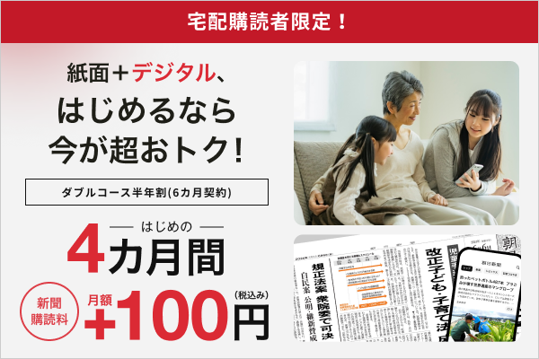 株式会社朝日新聞社4/9まで!ダブルコース半年割(6カ月契約)をはじめてお申し込みの方限定の特別価格 株式会社朝日新聞社(代表取締役社長CEO:角田克)は、2026年2月17日(火)~2026年4月9日(木)、朝日新聞(宅配)を購読中の方限定のデジタル版「ダブルコース半年割」を初めてお申し込みいただいた方を対象に、通常月額500円+新聞購読料が、ウェブ申し込み限定ではじめの4カ月間月額100円でご利用いただけるキャンペーンを実施します。このお得な機会にデジタルデビューしてみませんか。 ■お申…