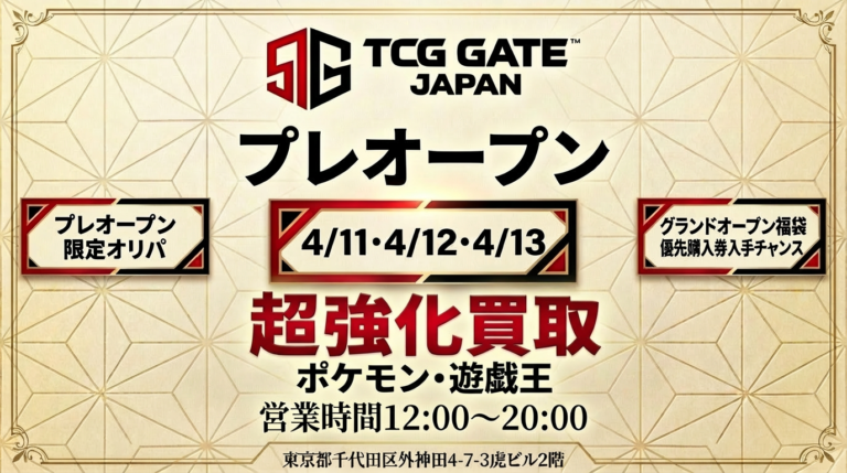 株式会社AnmorePSA鑑定カードオリパ販売や超強化買取、福袋優先購入企画をプレオープン期間中に先行実施 日本のトレーディングカード文化を世界へ発信する拠点として今春・秋葉原にグランドオープンを予定する「TCG GATE」(運営:株式会社Anmore)は、2026年4月11日(土)よりプレオープン営業を開始いたします。期間中はPSA10オリパの販売や超強化買取、グランドオープン当日の福袋優先購入券抽選など、限定企画を先行実施いたします。 ■ 秋葉原から世界へ–“JAPANESE IMPA…