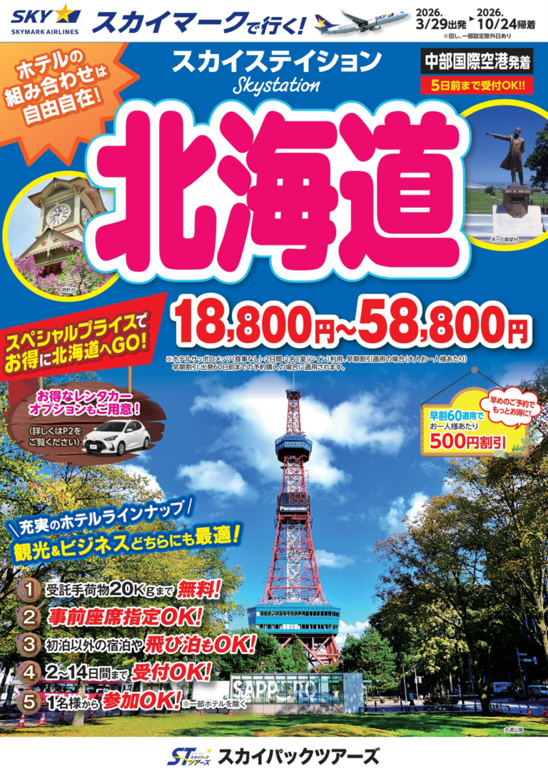 スカイパックツアーズ株式会社スカイマーク航空券とホテルがセットになった格安パッケージプラン『スカイステイション 北海道』を販売開始!札幌市内から旭川まで54の人気のホテルがラインナップ♪スカイマークを取り扱う専門店ならではの価格 スカイパックツアーズ株式会社(本社:東京都中央区、社長:横山正巳)は、スカイマークを利用した価格固定型のパンフレット旅行商品「スカイステイション 北海道」【中部国際空港発着】(2026年3月29日出発~2026年10月24日帰着)の販売を開始します。スカイマークだけを取…