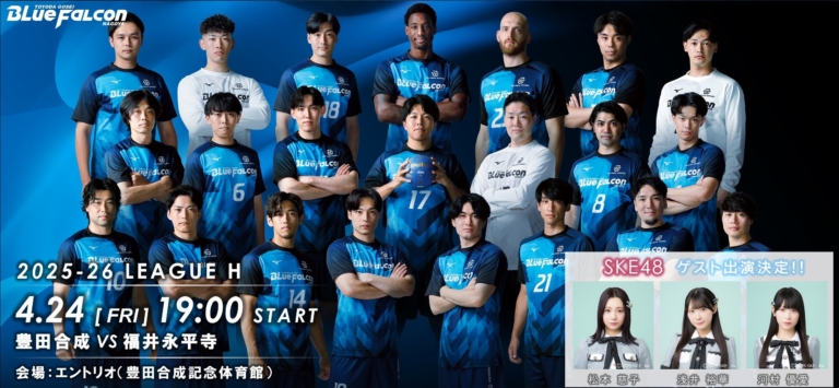 豊田合成ブルーファルコン名古屋が、4月24日(金)にエントリオでホーム大会を開催し、福井永平寺ブルーサンダーと対戦します。リーグ戦も終盤戦に入り、これまで19戦17勝2敗で好調を維持するブルーファルコン。対する福井永平寺もプレーオフ進出のために負けられない一戦となっており、好ゲームが期待されます。 今回は特別ゲストとして、SKE48の松本慈子さん、浅井裕華さん、河村優愛さんが来場し、会場を盛り上げてくれます。皆さまもぜひ会場にお越しいただき、熱いご声援をよろしくお…