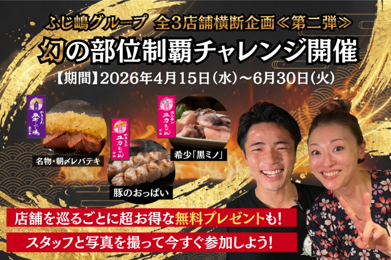【港区・新橋】“豚のおっぱい”や“幻の黒ミノ”を食い尽くせ!ふじ嶋グループ3店舗横断「幻のメニュー制覇チャレンジ」が開幕。スタッフとの写真でドリンクや希少部位が無料に!
