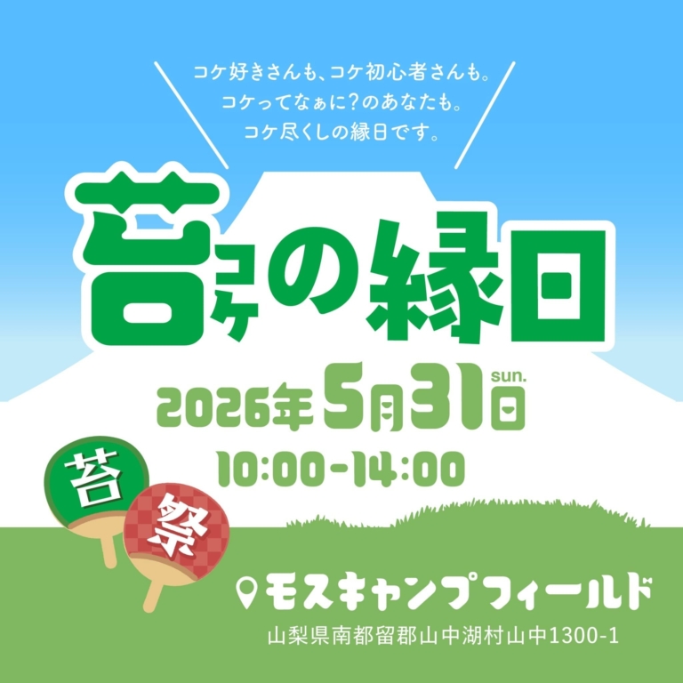 合同会社道草ワークショップ、苔観察、販売、栽培相談、飲食ブースまで。苔好きも初心者も楽しめる、体験型の苔イベント。 合同会社道草(東京都大田区)は、2026年5月31日(日)、山梨県山中湖村のキャンプ場「moss camp field(モスキャンプフィールド)」にて、1日限りの苔イベント**「苔の縁日」**を開催します。入場は無料、予約不要。苔をテーマにしたワークショップ、体験企画、物販、栽培相談、飲食ブースなどを通して、苔の魅力を気軽に楽しめるイベントです。