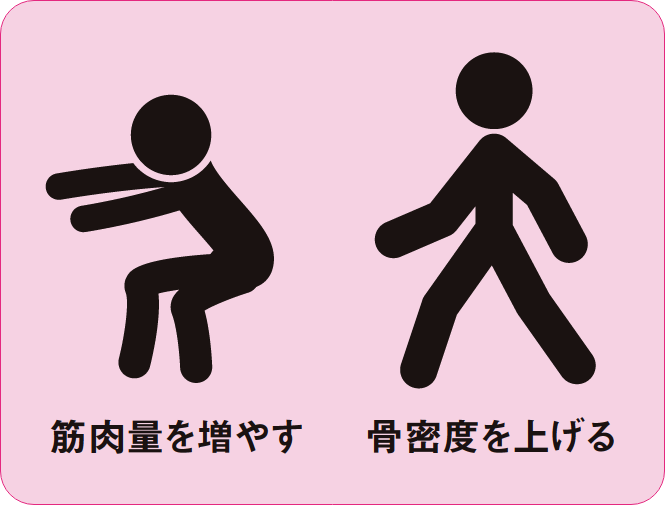 筋肉は収縮と弛緩(しかん)で強くなり、骨は重力の刺激を受けて骨密度が上がり、強化されます。筋トレや体操に加えて足踏みなど、骨に衝撃を与える動きも行うと効果的です。