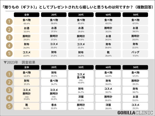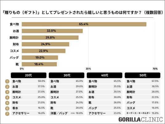 質問:「贈りもの(ギフト)」としてプレゼントされたら嬉しいと思うものは何ですか?(複数回答)