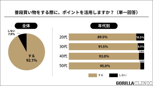 9割以上がポイントを活用していることが判明。年代別では、年代が上がるごとに活用率が上がる結果に。