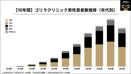 「上記グラフ」は、創業から現在までの10年間【ゴリラクリニックに来院される男性患者数推移(年代別)】(※)。来院される男性のボリュームゾーンは20代~30代ですが、近年、顕著に増加しているのが40代以上のミドル世代男性。2018年以降、40代以上の患者数が顕著に増加しています。また50代以上の患者層も増え始めており、ミドル世代やシニア世代からの関心が高まっていると言えます。