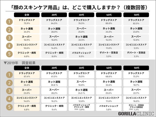 質問:「顔のスキンケア商品」のアイテムは、どこで購入しますか?(複数回答)