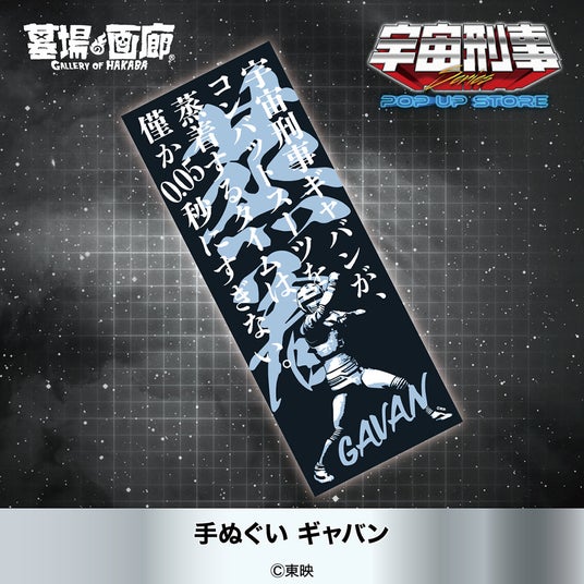 宇宙刑事ギャバンの手ぬぐい登場!シンプルかつ大きなプリントが映えるギャバンの勇姿。そして、宇宙刑事シリーズの名演出を決定付けた、あの名ナレーションを完全再現!いつでも携帯していたい、蒸着ならぬ常着な逸品!