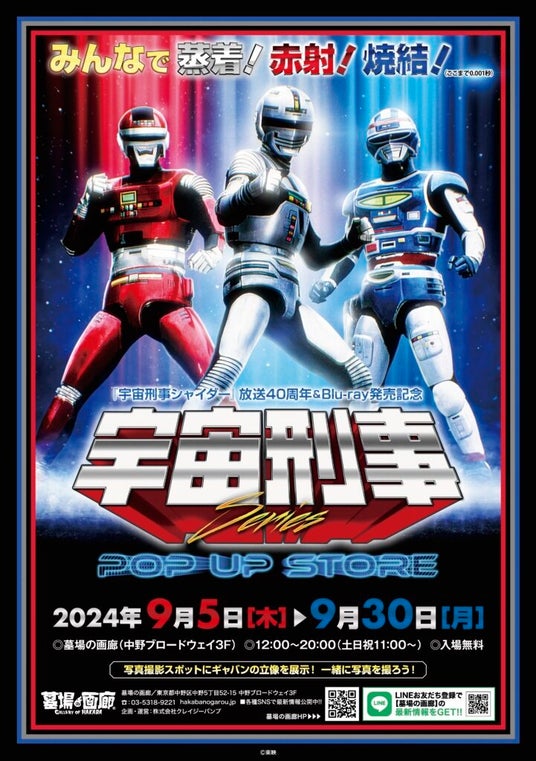 マンガ、アニメ、特撮などを始めとするサブカルチャーをテーマとした企画展を開催・運営している株式会社クレイジーバンプは2024年9月5日(木)~9月30日(月)の期間で墓場の画廊中野店と墓場の画廊ONLINE STOREにて開催する【宇宙刑事シリーズPOP UP STORE】で販売する第二弾商品情報を公開致します。