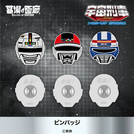 宇宙刑事ギャバン、シャリバン、シャイダーの3人の顔が、立体的なピンバッジになって登場!好みの一人に絞るもよし、3人揃えるもよし。つければ一際目立つワンポイントに。