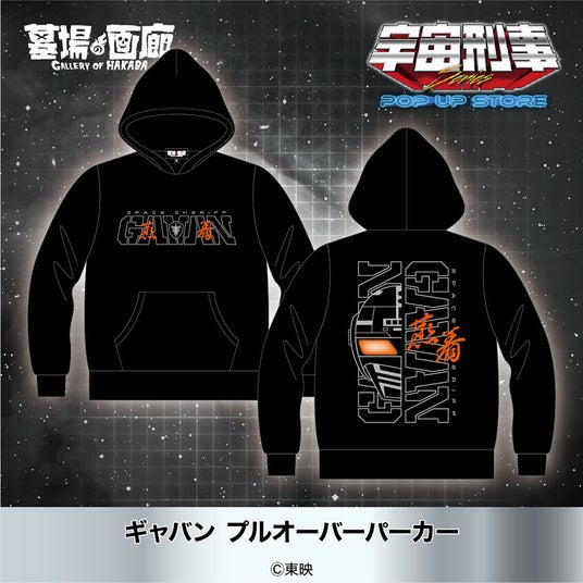 宇宙刑事ギャバンのプルオーバーパーカー登場!ブラックボディに映えるシンプルながら迫力ある、SF感満載のラインアートデザイン。背中には目が光るギャバンと印象的な蒸着の文字。肌寒い季節にピッタリな、着るだけで胸のエンジンに火が付くパーカーだ。