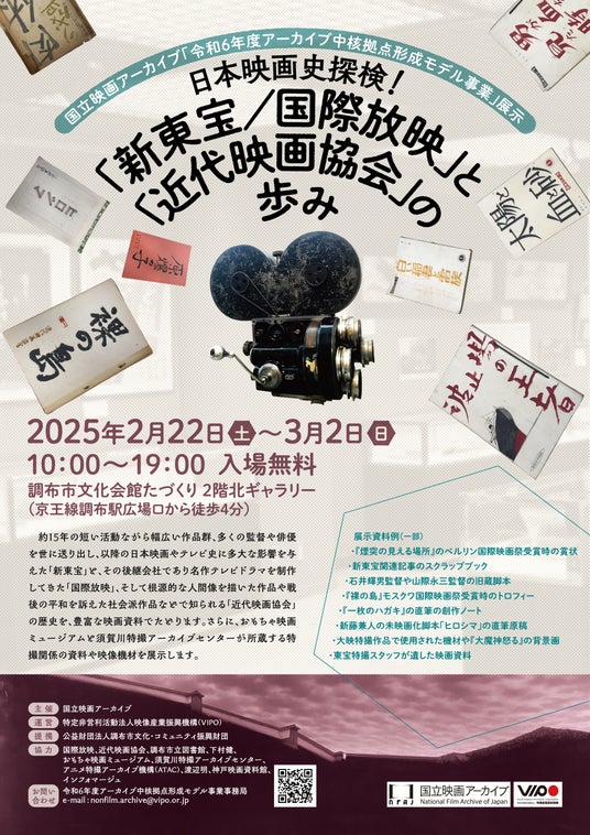 特定非営利活動法人映像産業振興機構(略称:VIPO[ヴィーポ]、理事長:松谷孝征、東京都中央区)は、国立映画アーカイブの「令和6年度アーカイブ中核拠点形成モデル事業」の一環として、「映画のまち調布 シネマフェスティバル2025」内で、映画資料の展示「日本映画史探検! 《新東宝/国際放映》と《近代映画協会》の歩み」を開催いたします。