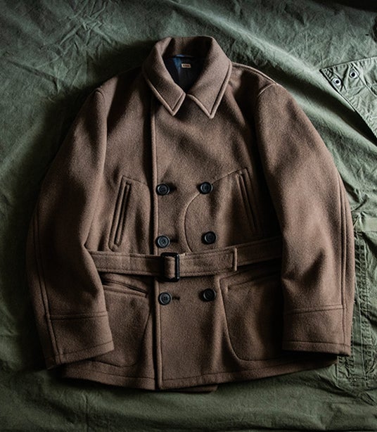2024FW新作のPコートは、ヴィンテージのウエストベルト付きPコートをモチーフに、オリジナルデザインに仕上げました。