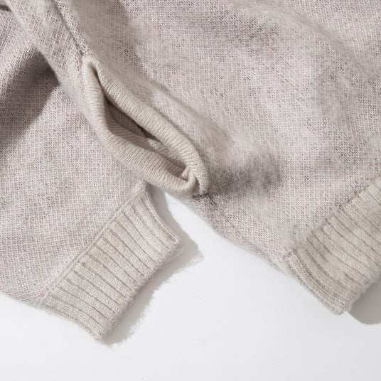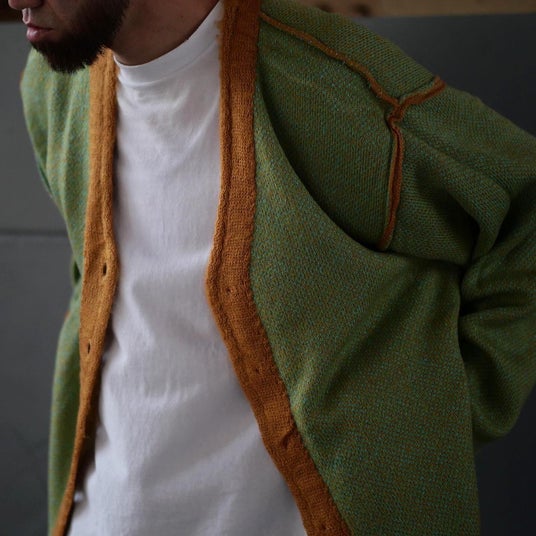 裏地にもこだわりを加え、複数色の糸を使った鮮やかなカラーリングを採用。表地にはまばらなネップが現れ、裏返すと2 トーンのニットとして楽しむことも可能です。