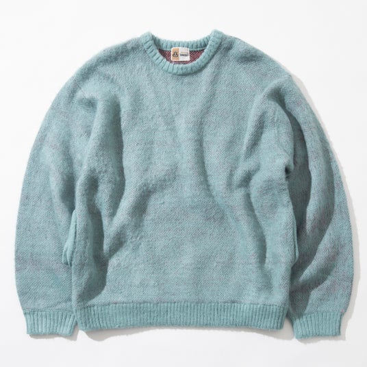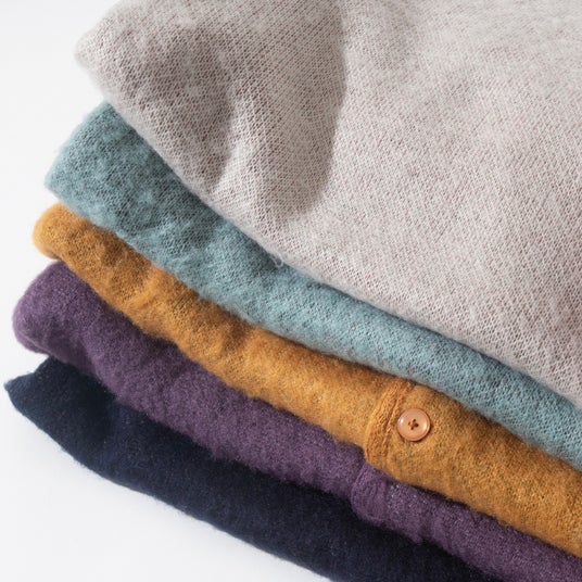 アクリル素材を使用し、編地を引っ掻いて長い毛足と光沢を生み出す「シャギー加工」を施すことで、60~70 年代のウールモヘアを彷彿とさせる風合いを実現しました。柔らかでチクチクしない肌触りと、手軽に洗える点もポイントです。