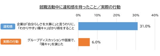 就活経験者の内、3人に1人が「わかりやすい陽キャばかり得をすること」に違和感を持っています。「陽キャ」の性格をもっている人に対して、不公平さを感じていました。その一方、実際に「グループディスカッションや面接で陽キャを演じた」と回答した人は6.0%にとどまり、得だと分かりつつも陽キャになりきれないZ世代の不器用さがうかがえました。