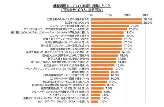 学生の本分は勉強ですが、就活経験者の27.0%は、「大学の勉強より就職活動を優先しなければいけないこと」に違和感を持っており、実際に「就職活動のために大学の授業を休んだ」と回答した人は28.0%に上りました。これは、大学などの教育機関にとっても大きな問題であると考えられます。