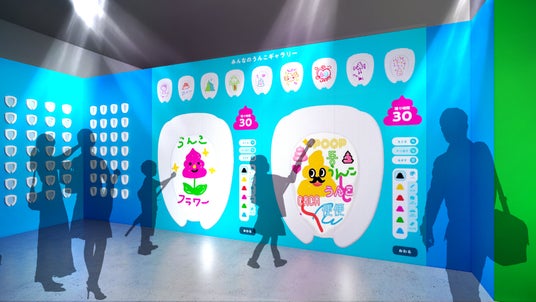 今回発表したのは、「うんこをなげろ」「ダンシングうんこルーム」「えがけ!みんなのうんこ」「クソゲーセンター」の4つ(※2)。さらに、「うんこが世界を可愛くする。」というテーマを表現した新たなキービジュアルもお披露目しました。