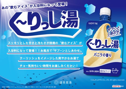 「クーリッシュ コーヒー」発売記念!ロッテ監修のもと、健美薬湯株式会社から温浴施設向けに販売中の入浴料「く~りっし湯」が楽しめる浴場施設3店舗で、発売前に「クーリッシュ コーヒー」のサンプリングを実施します。「クーリッシュ バニラ」をイメージした爽やかなお風呂に浸かった後に、発売前の「クーリッシュ コーヒー」を飲んでチョー気持ちいいひとときをお楽しみください。