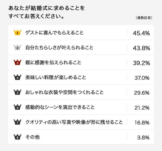 「ゲストに喜んでもらえること」が45.4%、「自分たちらしさが叶えられること」が43.8%、この2つの項目が40%を超えて重要視されていることが分かりました。次いで「親に感謝を伝えられること」39.2%、「美味しい料理が楽しめること」37.0%、「おしゃれな衣裳や空間をつくれること」29.6%と続きました。